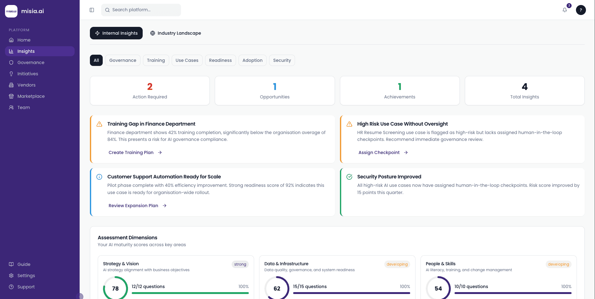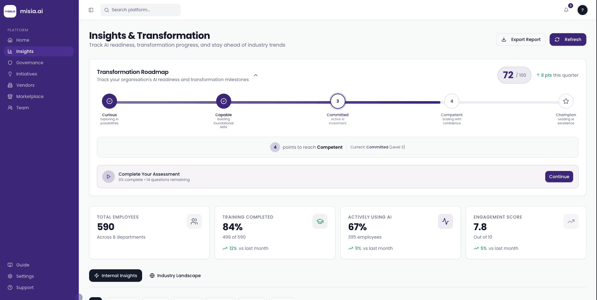 misia.ai brings teams together with a single, shared system, ensuring AI adoption is coordinated, consistent, and governed across the organisation.